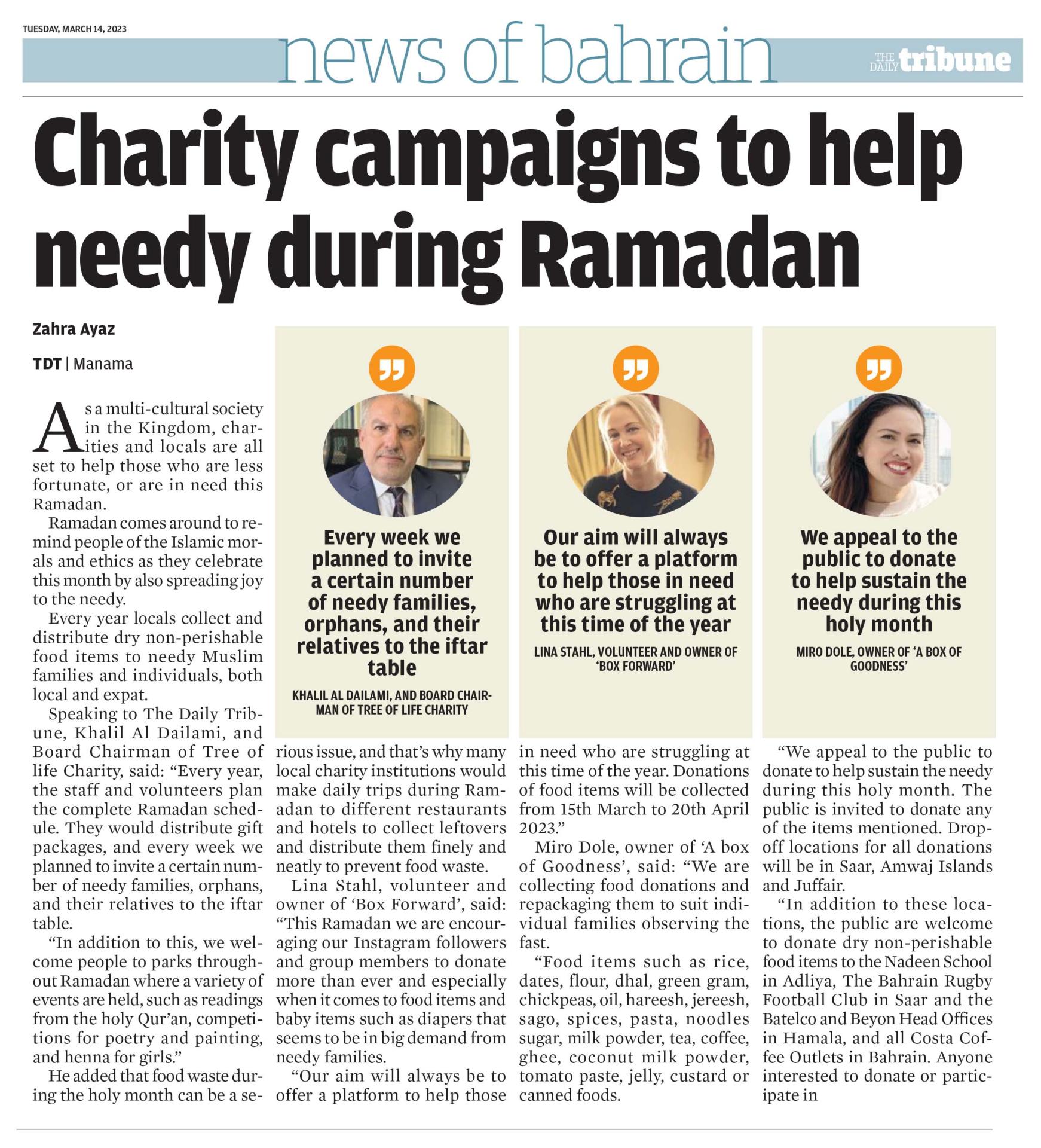 the complete Ramadan schedule. They would distribute gift packages, and every week we planned to invite a certain number of needy families, orphans, and their relatives to the iftar table. “In addition to this, we welcome people to parks throughout Ramadan where a variety of events are held, such as readings from the holy Qur’an, competitions for poetry and painting, and henna for girls.” He added that food waste during the holy month can be a serious issue, and that’s why many local charity institutions would make daily trips during Ramadan to different restaurants and hotels to collect leftovers and distribute them finely and neatly to prevent food waste. Lina Stahl, volunteer and owner of ‘Box Forward’, said: “This Ramadan we are encouraging our Instagram followers and group members to donate more than ever and especially when it comes to food items and baby items such as diapers that seems to be in big demand from needy families. “Our aim will always be to offer a platform to help those in need who are struggling at this time of the year. Donations of food items will be collected from 15th March to 20th April 2023.” Miro Dole, owner of ‘A box of Goodness’, said: “We are collecting food donations and repackaging them to suit individual families observing the fast. “Food items such as rice, dates, flour, dhal, green gram